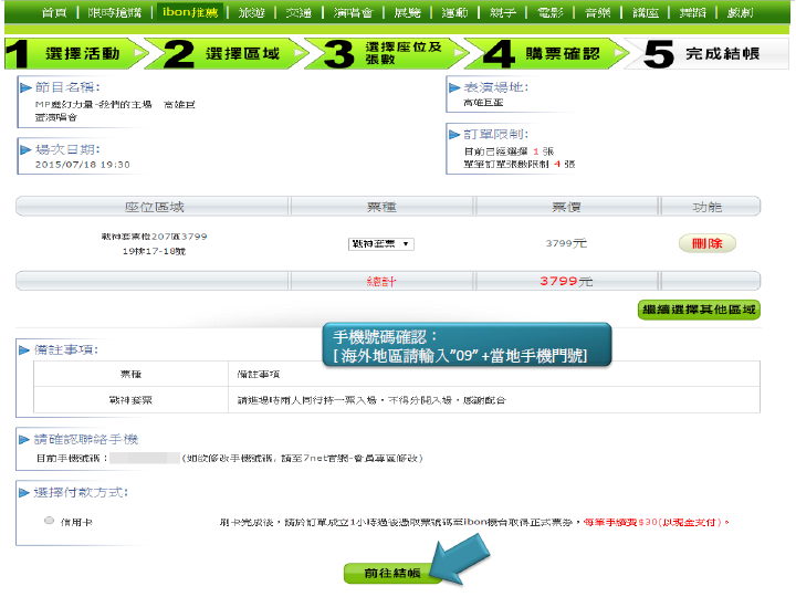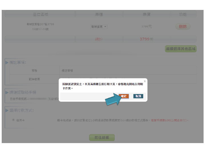 步驟9.確認座位、付款方式,點選結帳