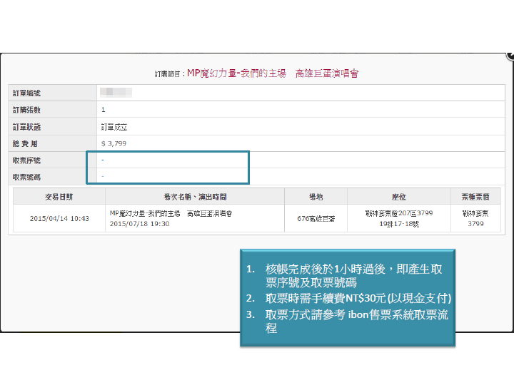 步驟16.取得「取票序號」及「取票號碼」至ibon機台取票