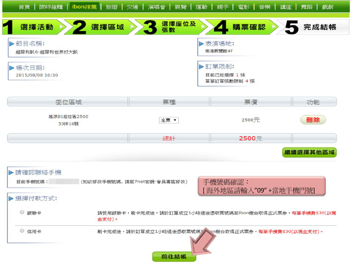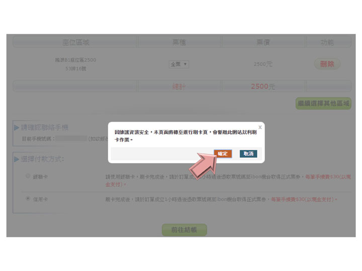 步驟9.確認座位、付款方式,點選結帳