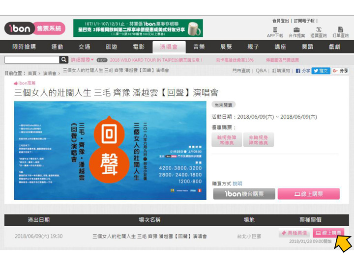 【三個女人的壯闊人生 三毛 齊豫 潘越雲【回聲】演唱會】ibon 網站購票流程