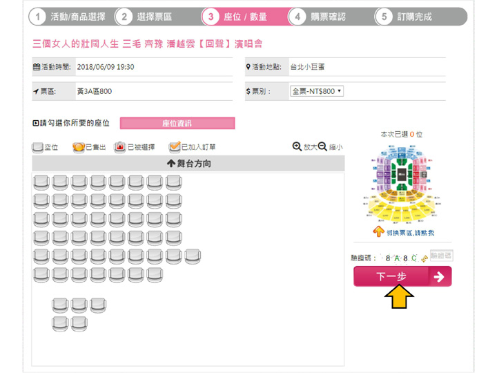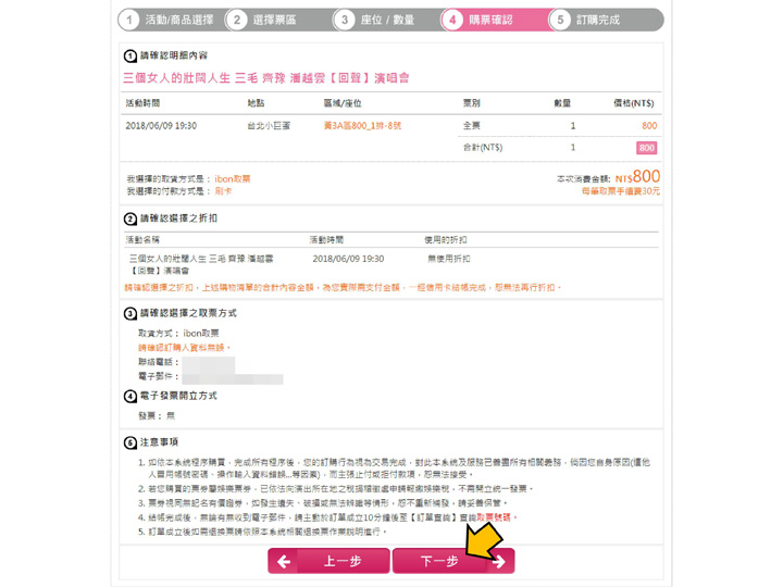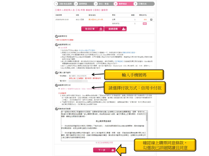 步驟6.確認票種張數、輸入手機、付款方式,點選下一步