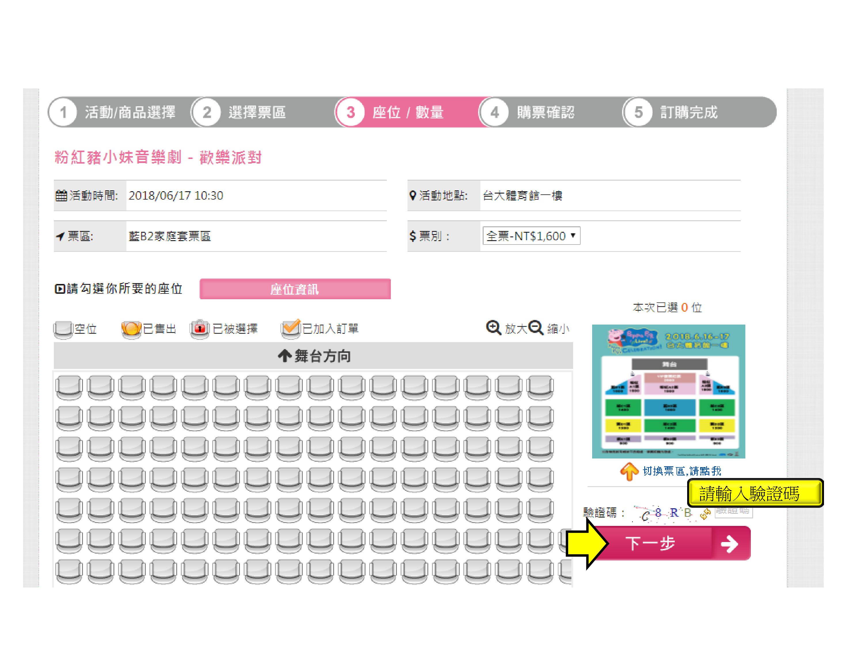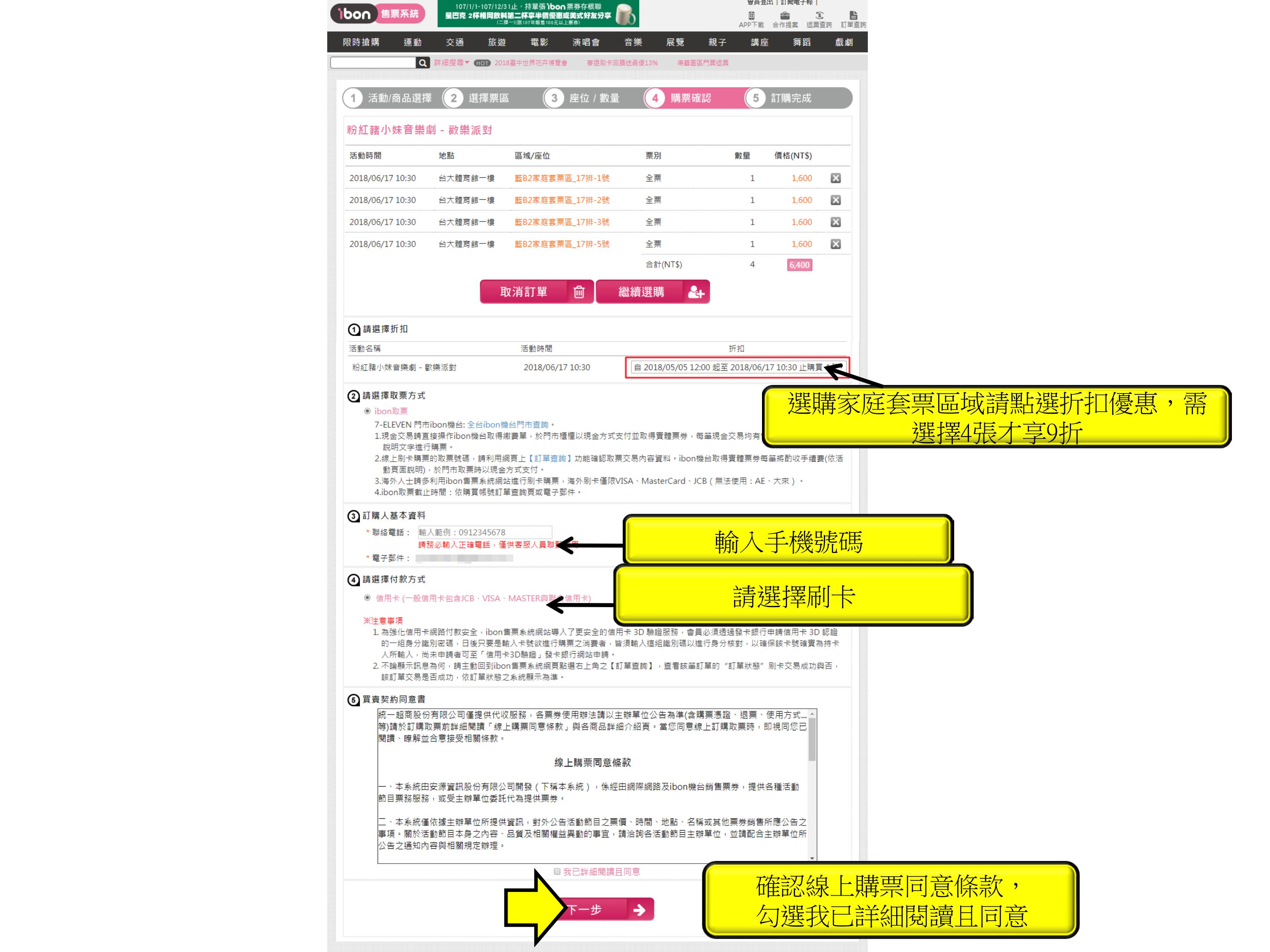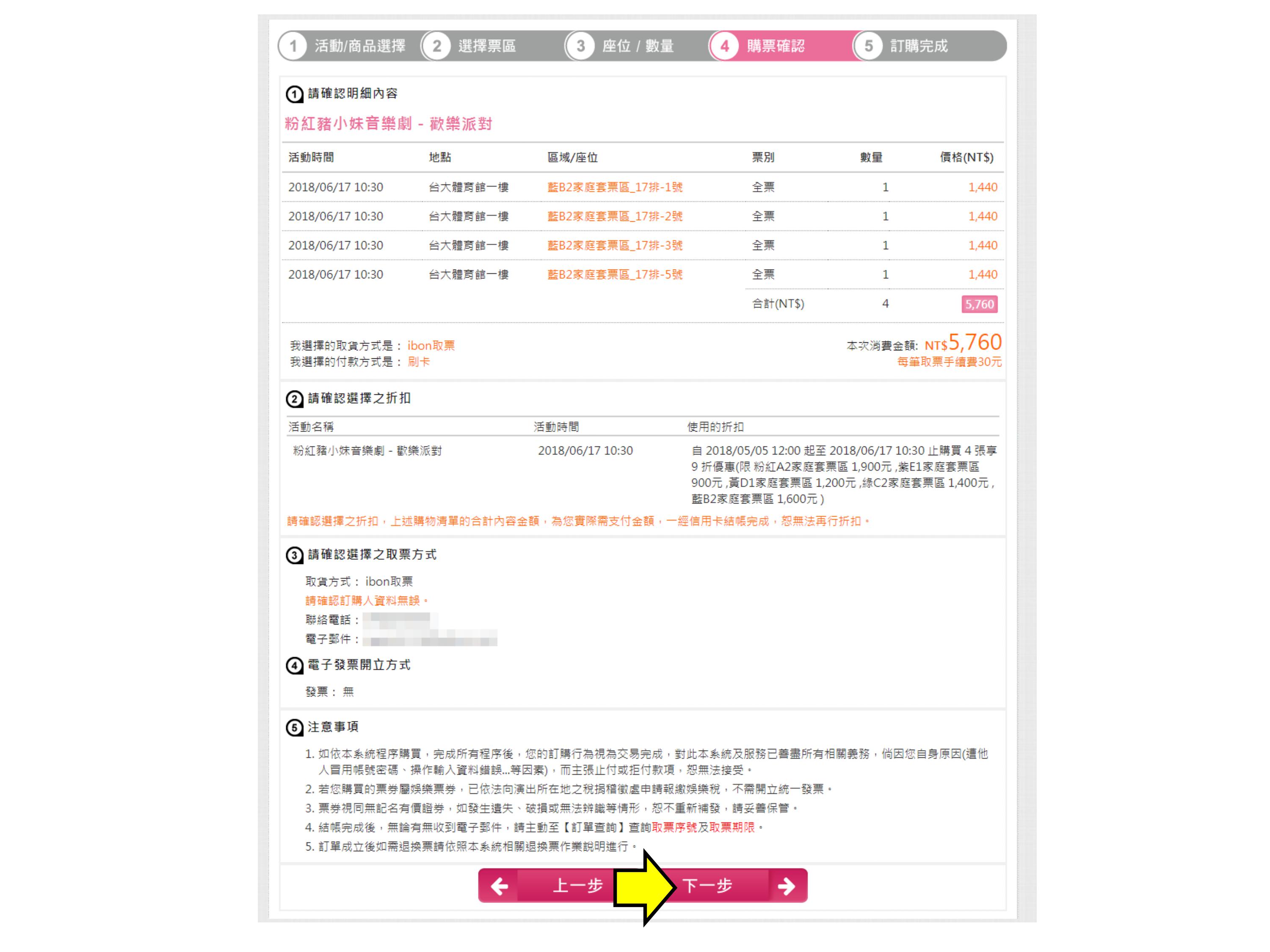 步驟6.確認票種張數、輸入手機、付款方式,點選下一步