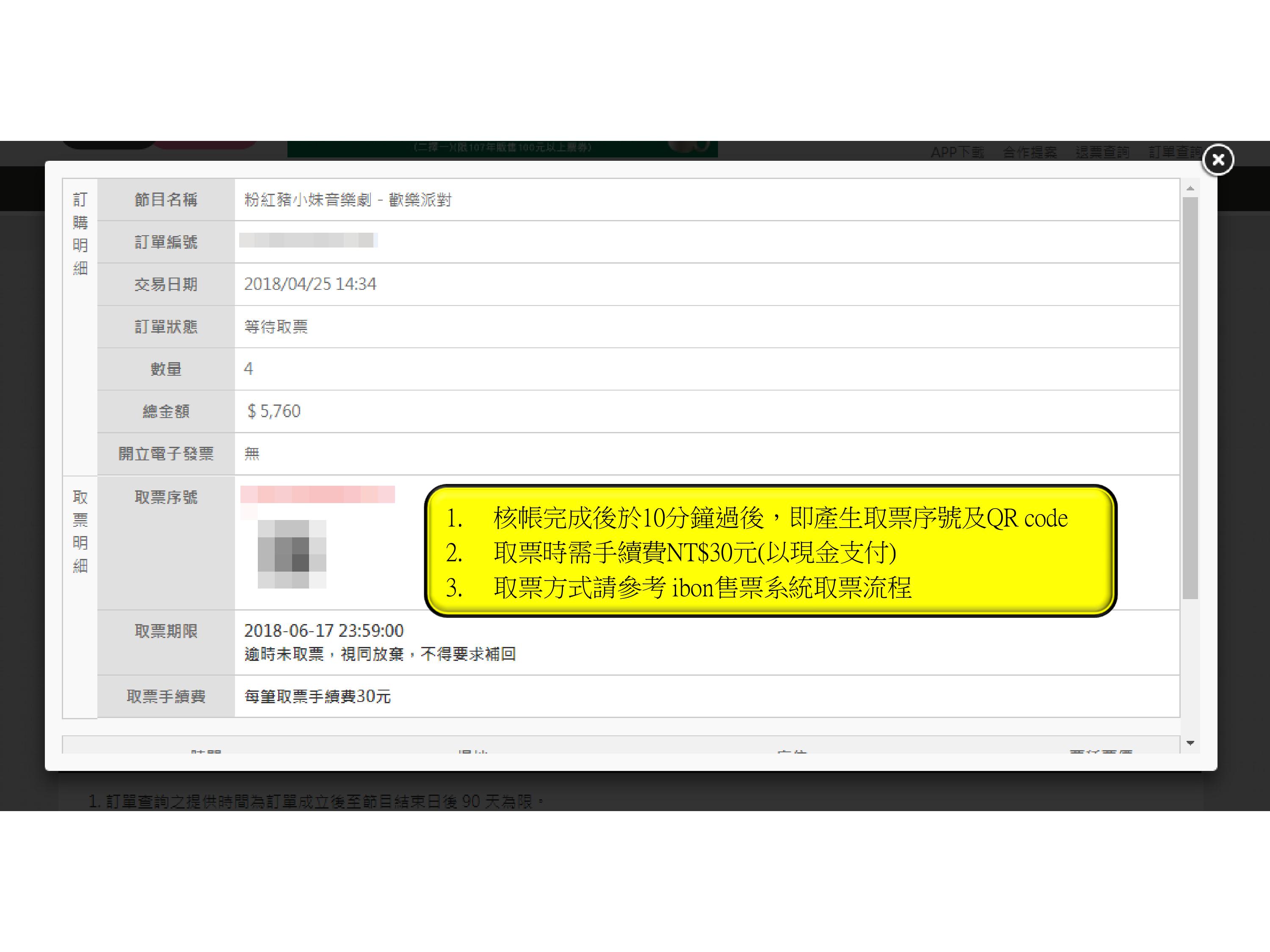 步驟12.取得「取票序號」及「QR code」至ibon機台取票