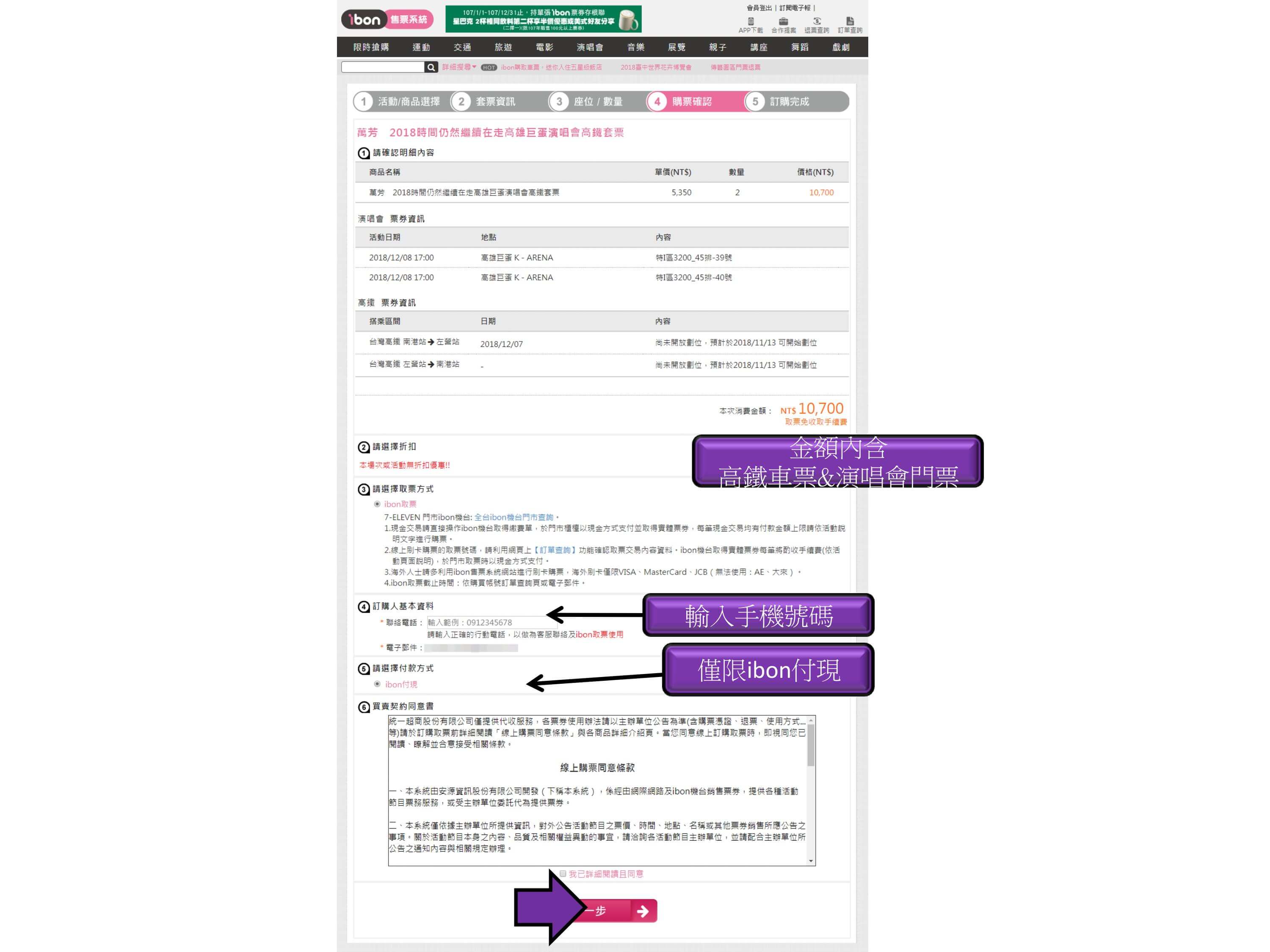 步驟7.確認票券資訊、輸入手機、付款方式,點選下一步