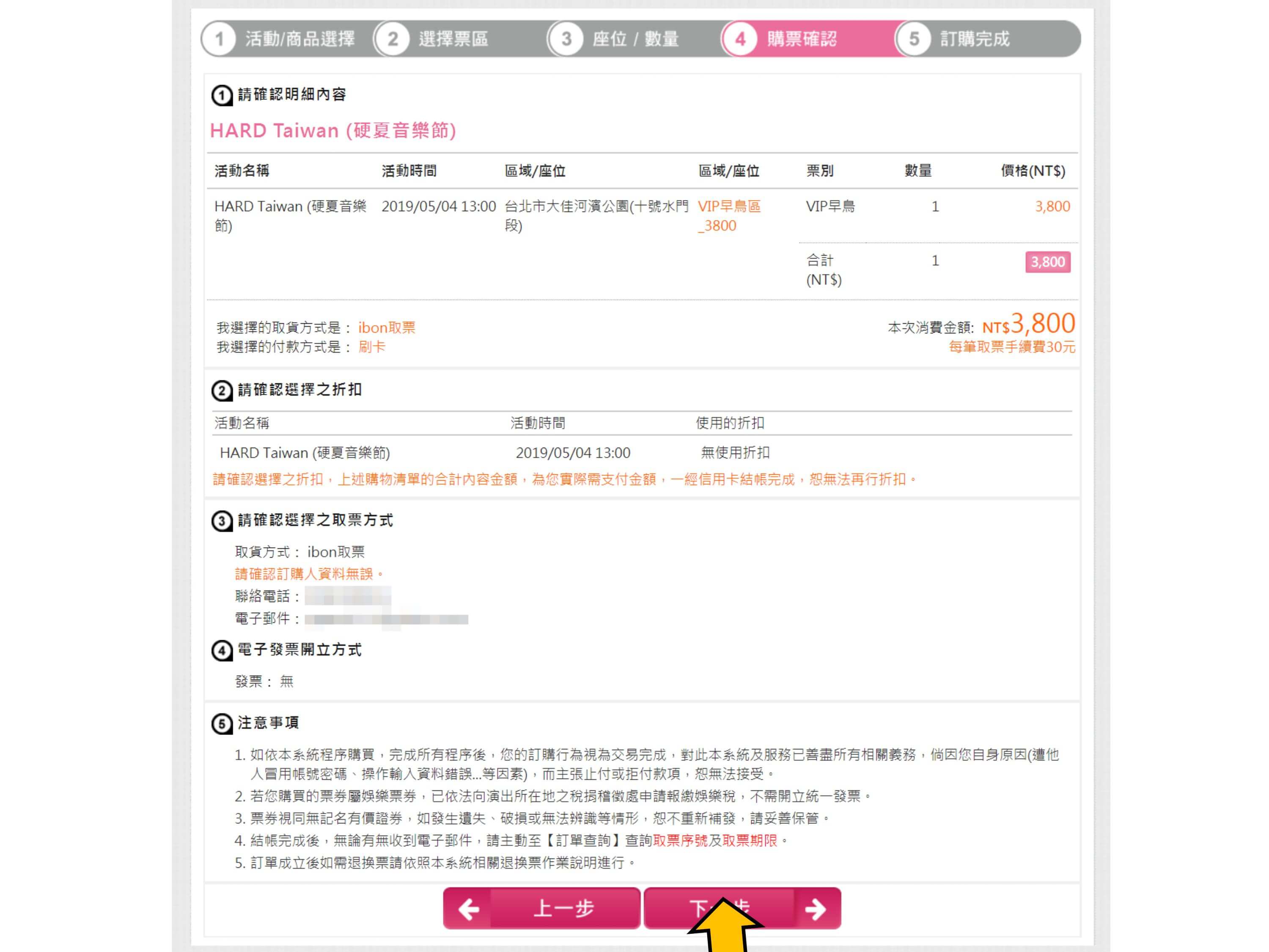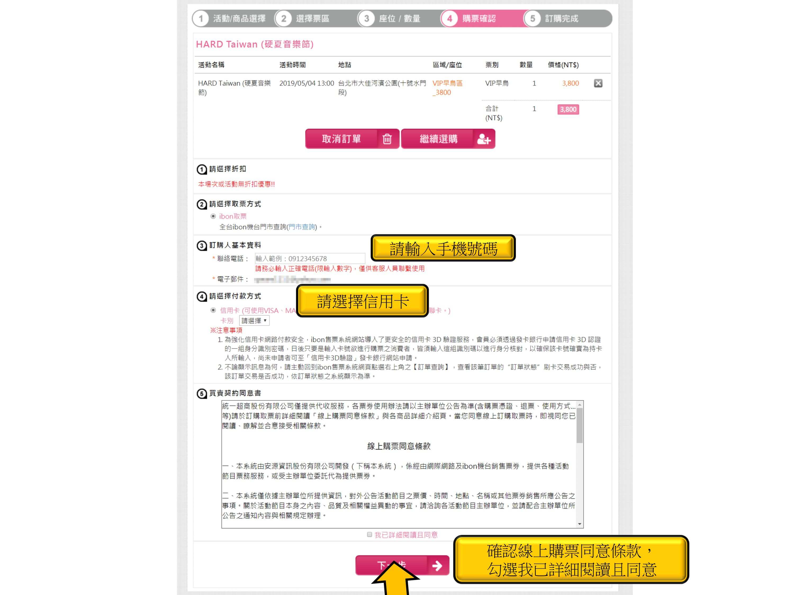 步驟6.確認票種張數、輸入手機、付款方式,點選下一步