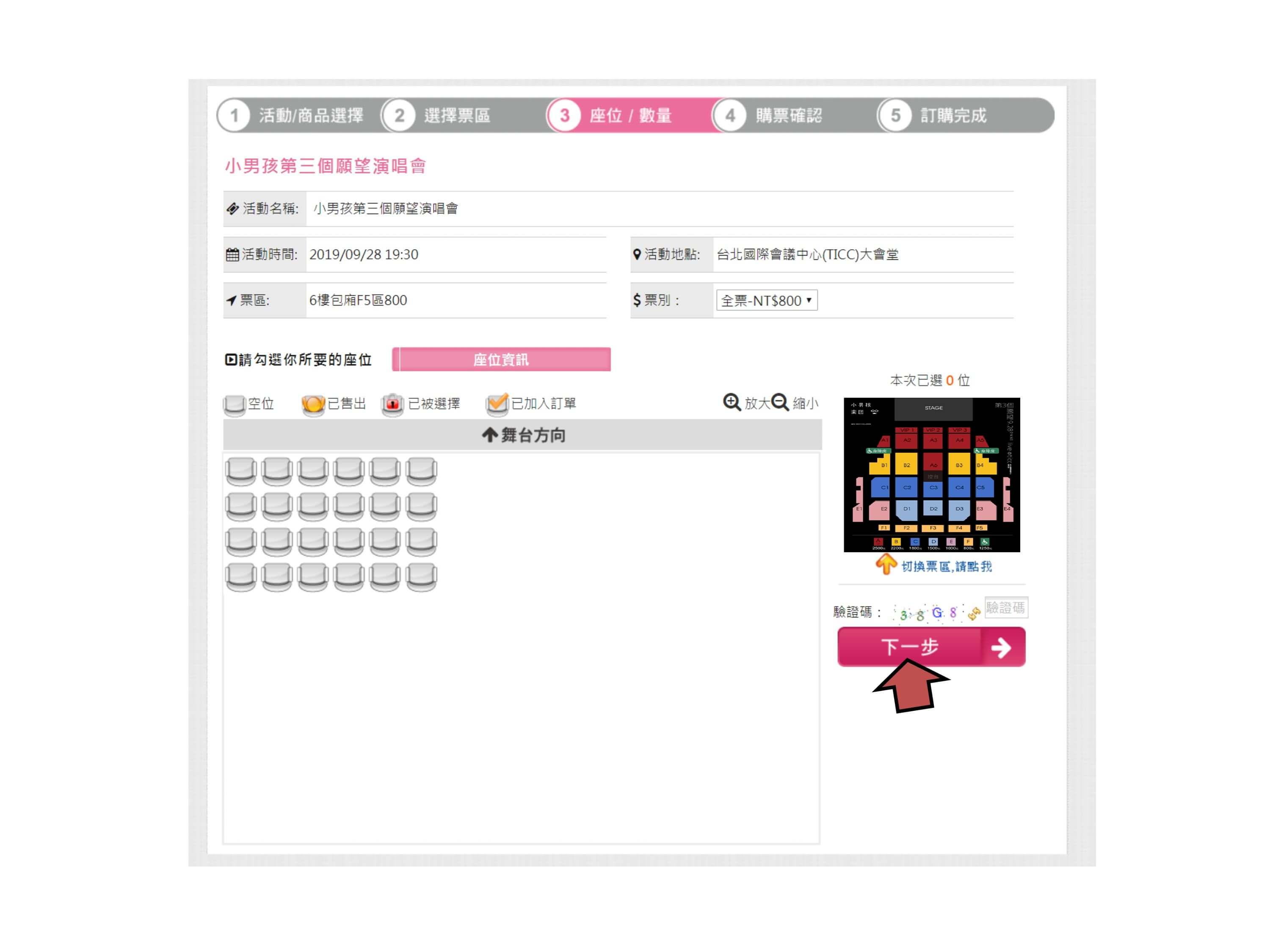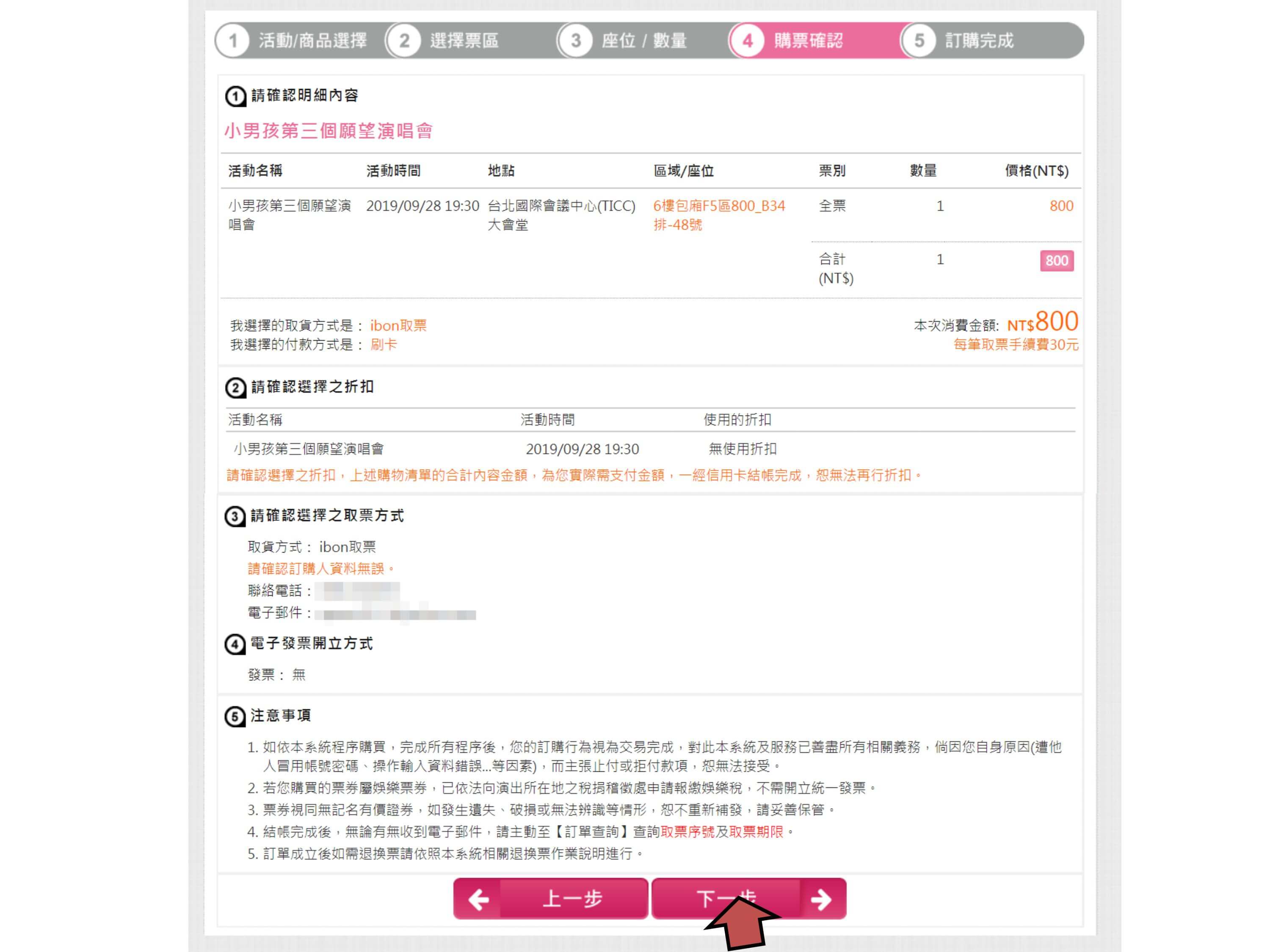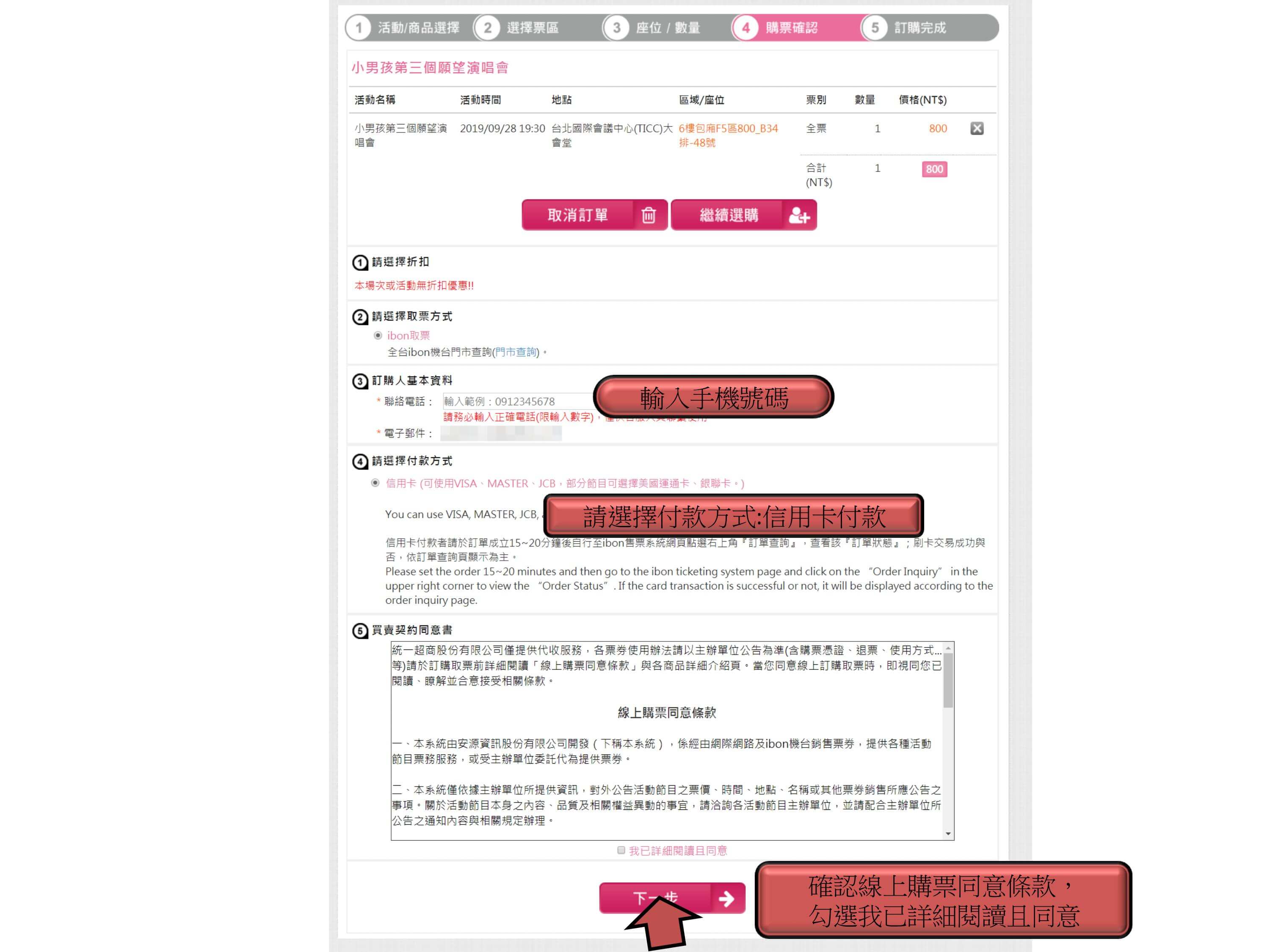 步驟6.確認票種張數、輸入手機、付款方式,點選下一步