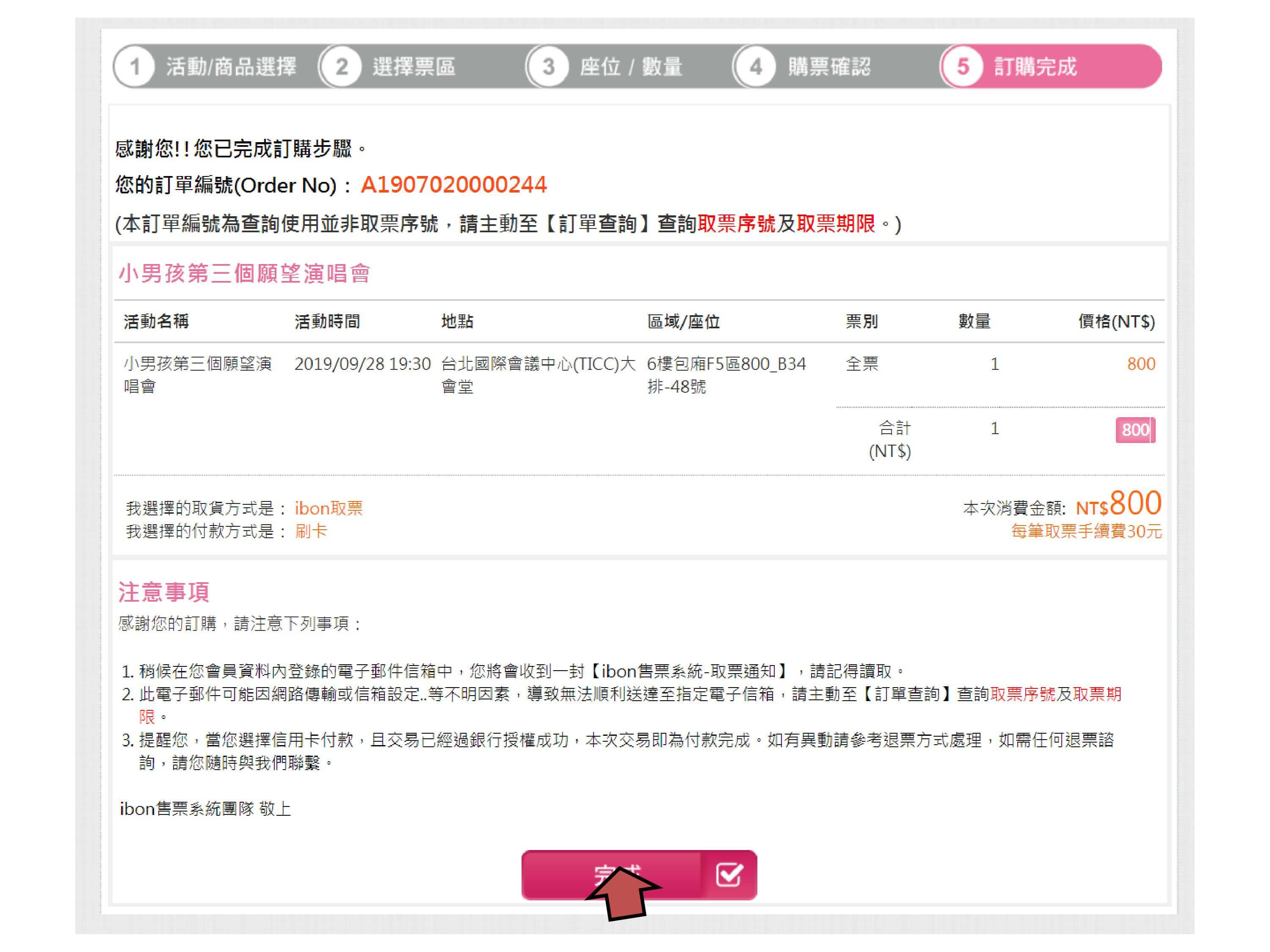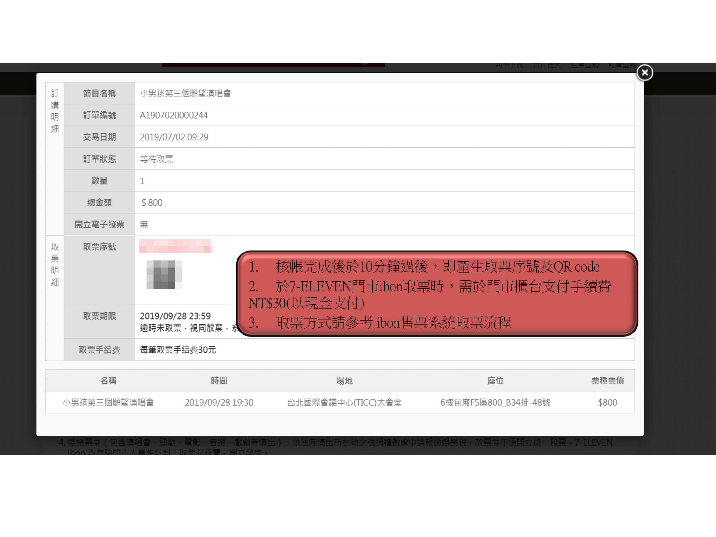 步驟13.取得「取票序號」及「QR code」至ibon機台取票