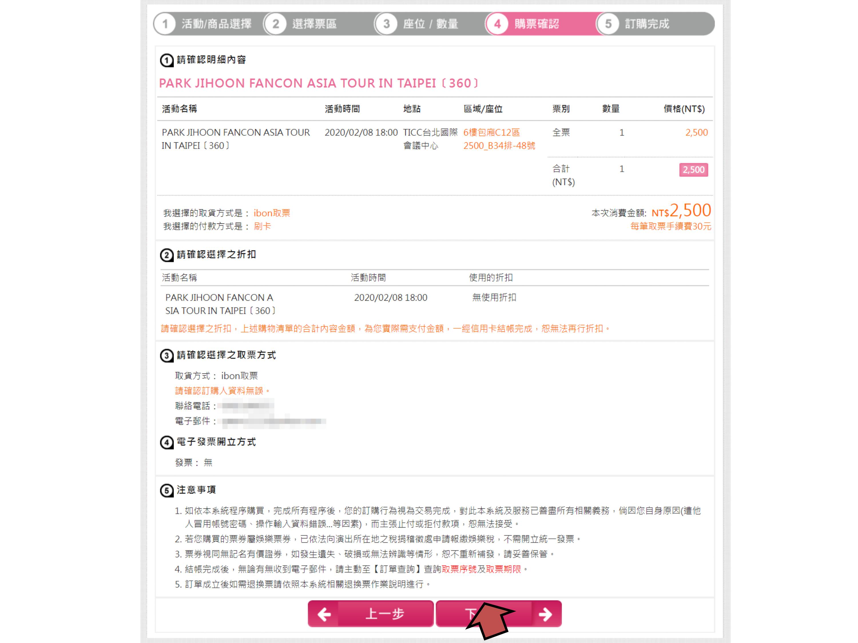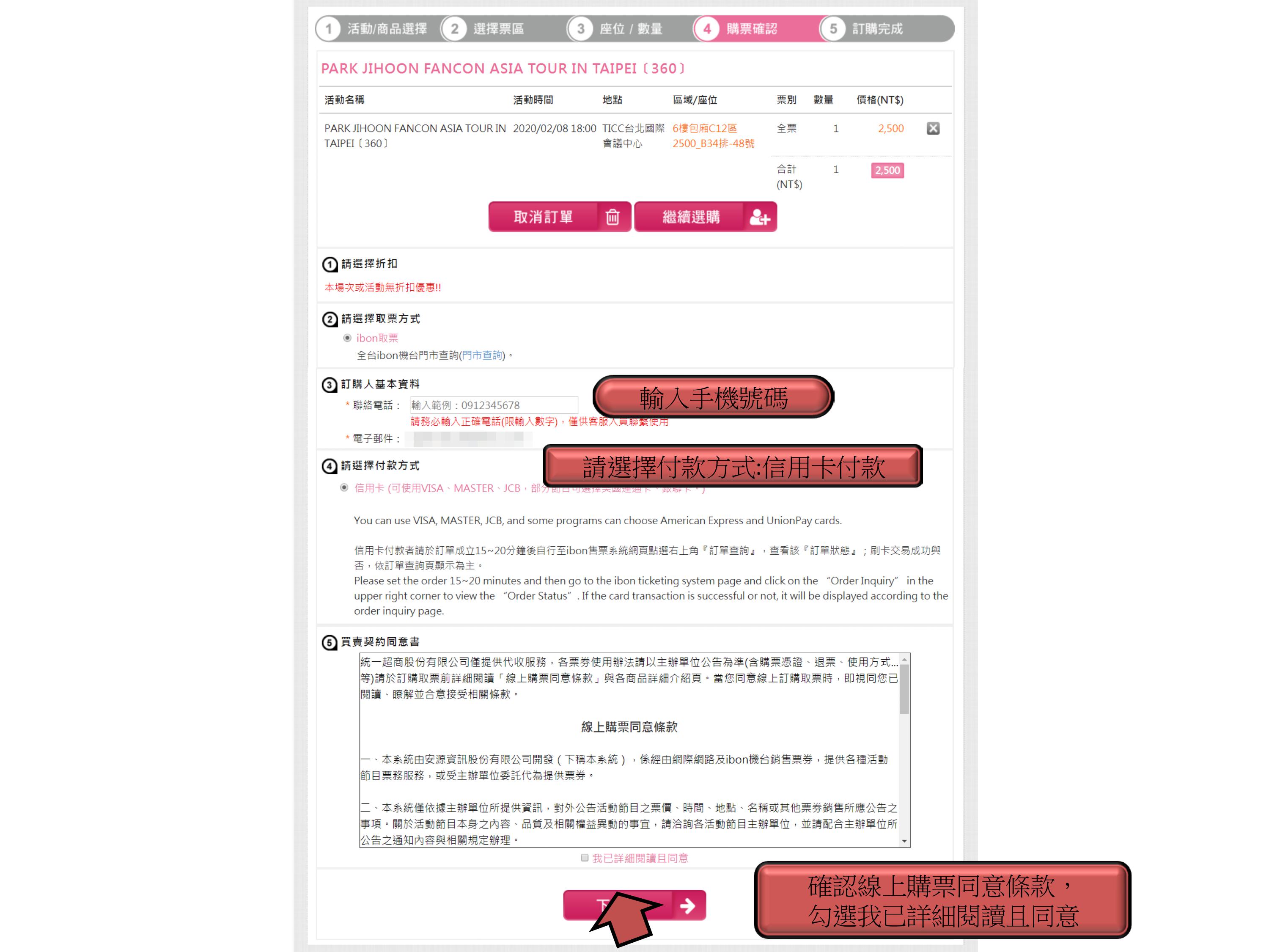步驟7.確認票種張數、輸入手機、付款方式,點選下一步