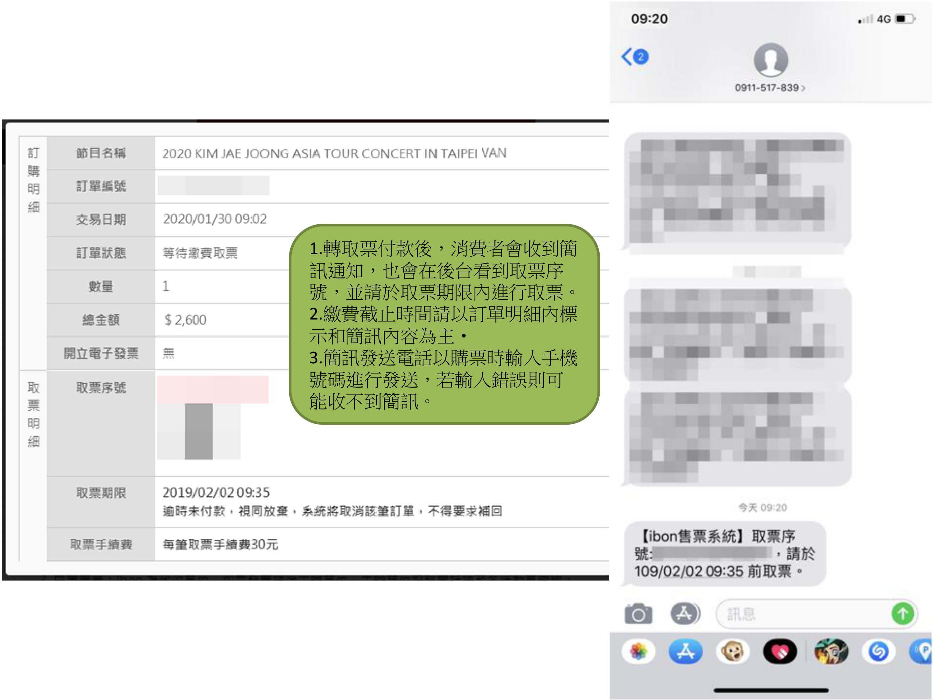步驟3.轉現金付款的訂單消費者會收到簡訊,簡訊會發送到購票時輸入的手機號碼