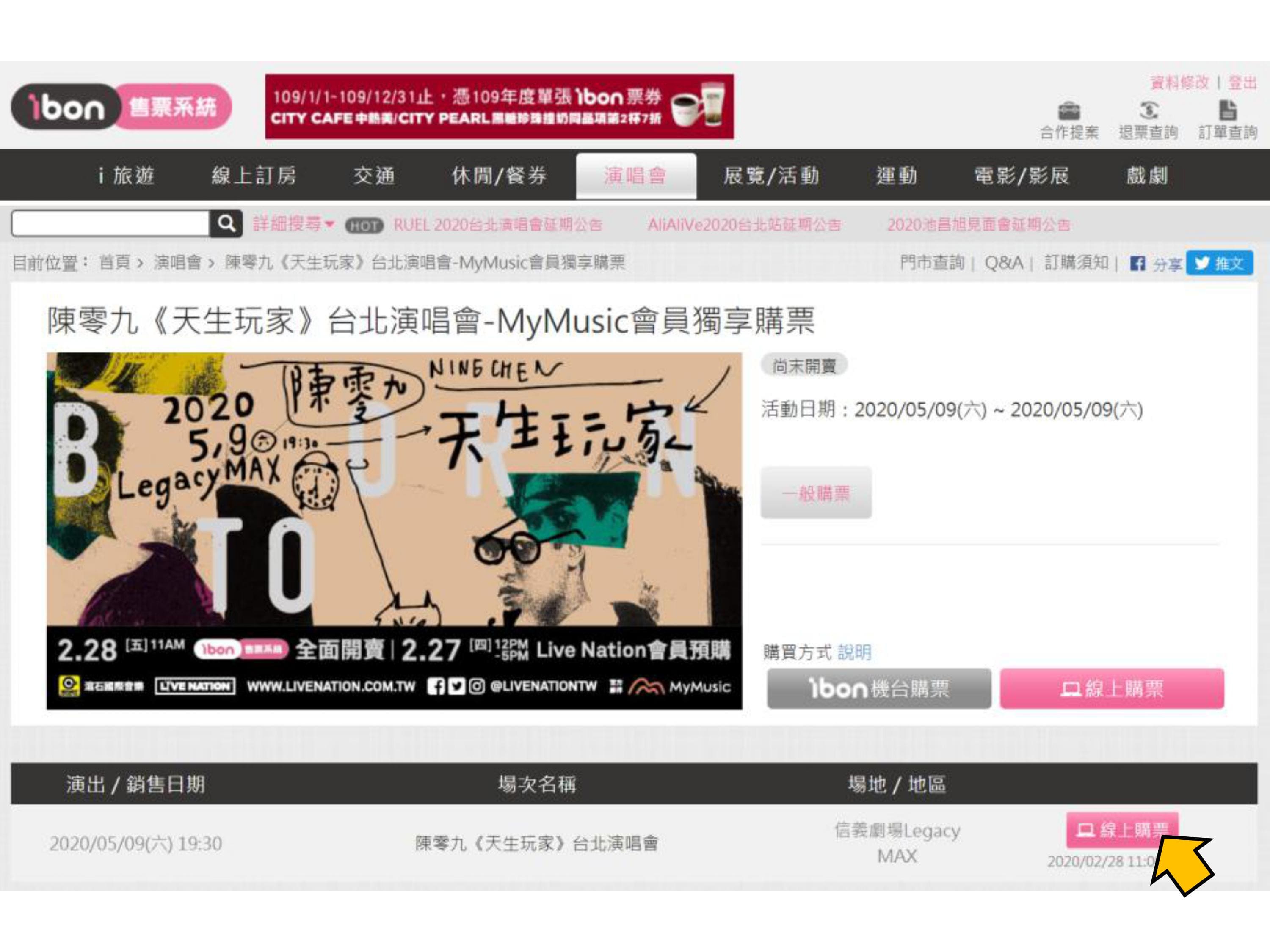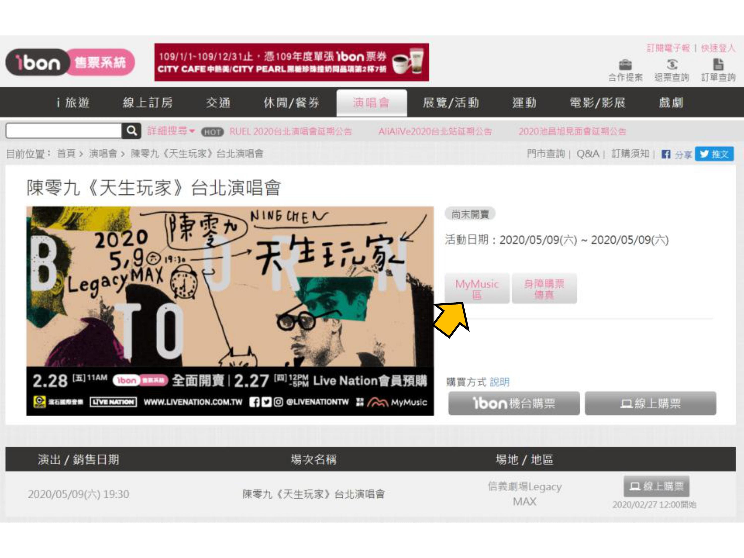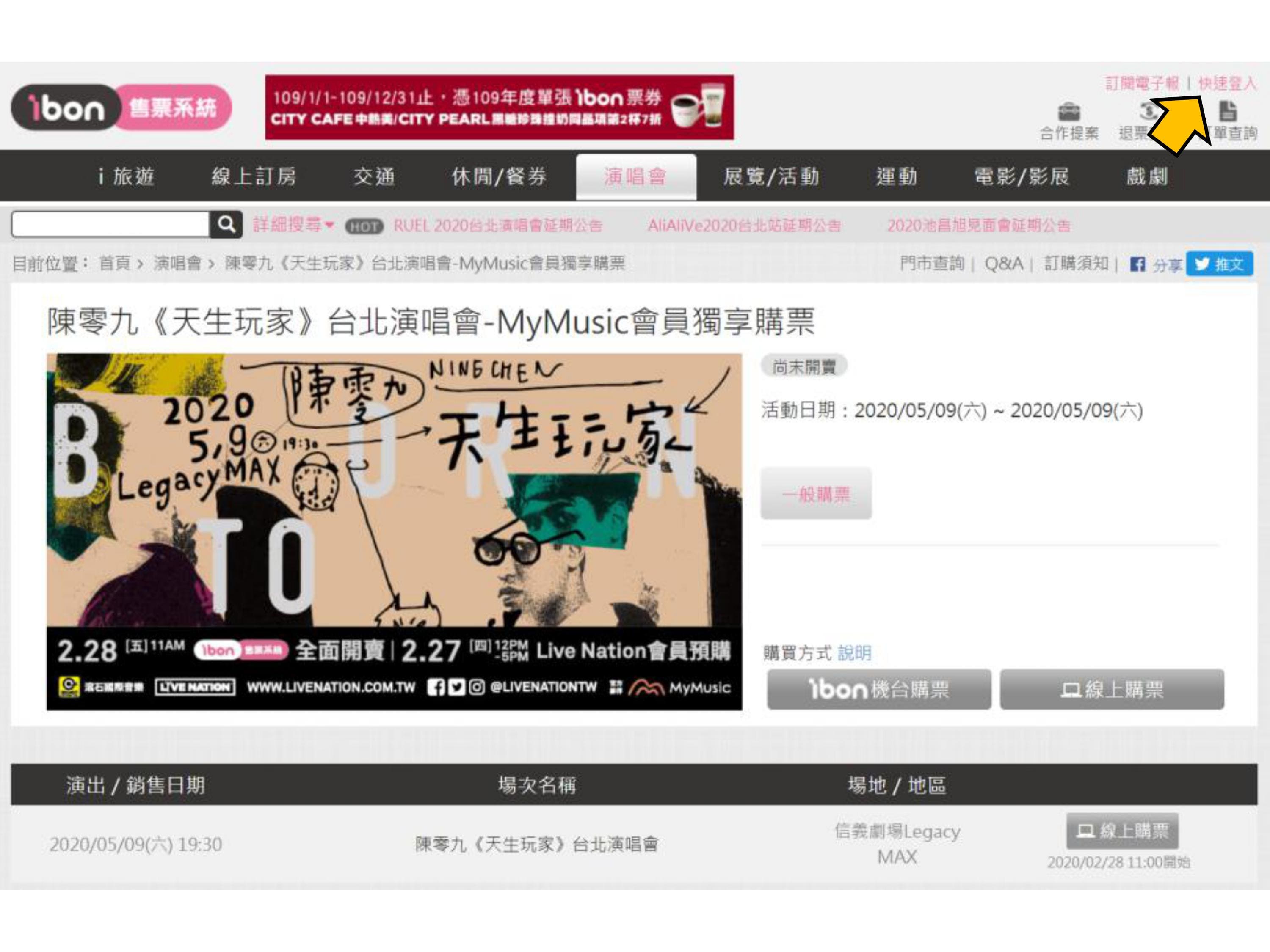 【陳零九《天生玩家》台北演唱會】ibon 網站MyMusic會員預購流程