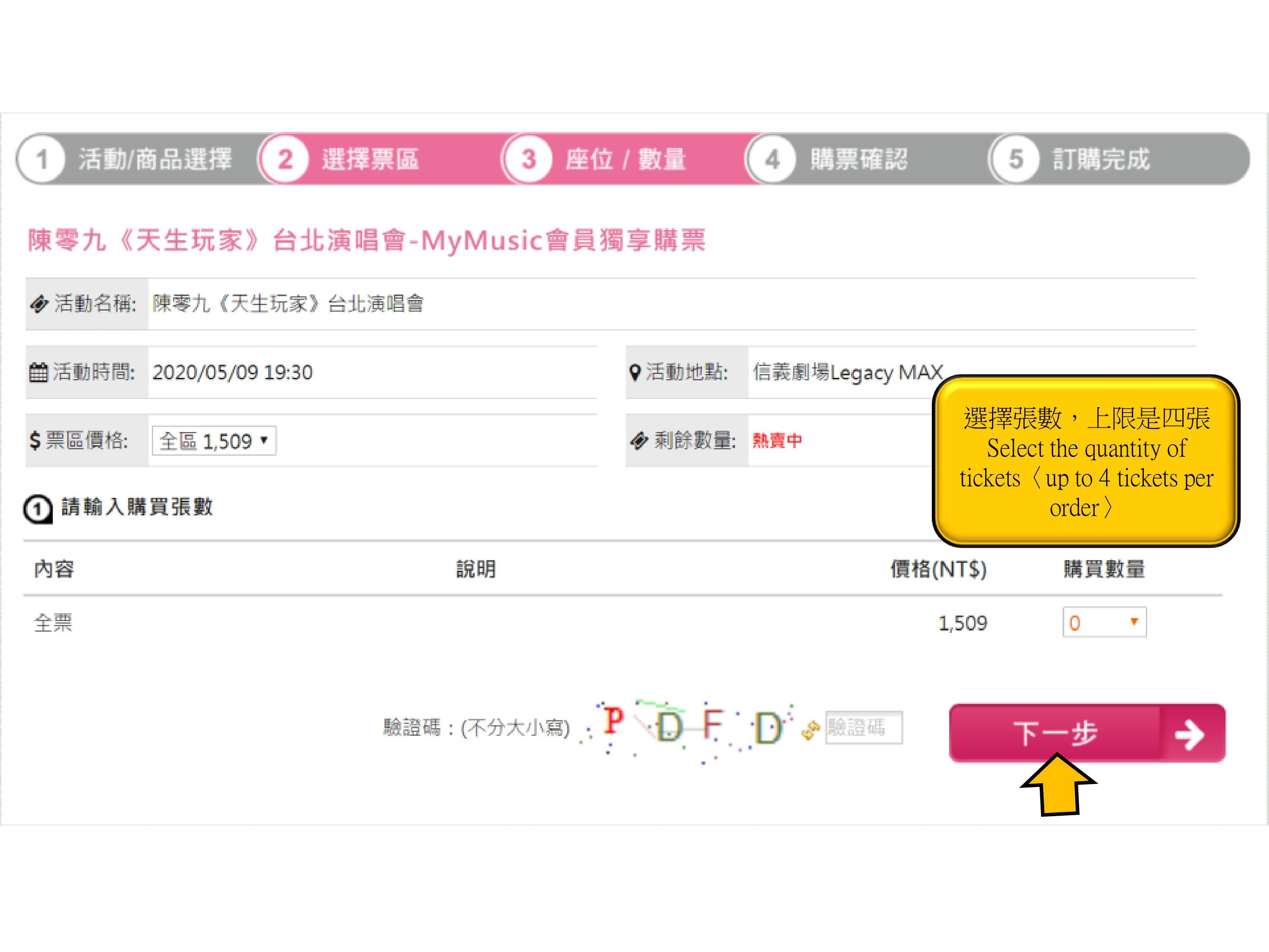 Step 7.Select the quantity of tickets〈up to 4 tickets per order〉