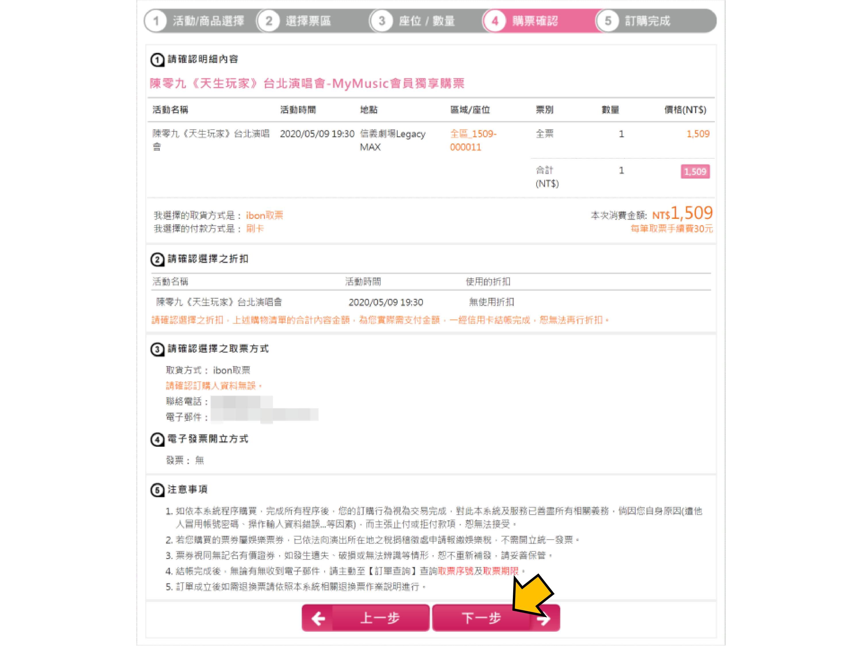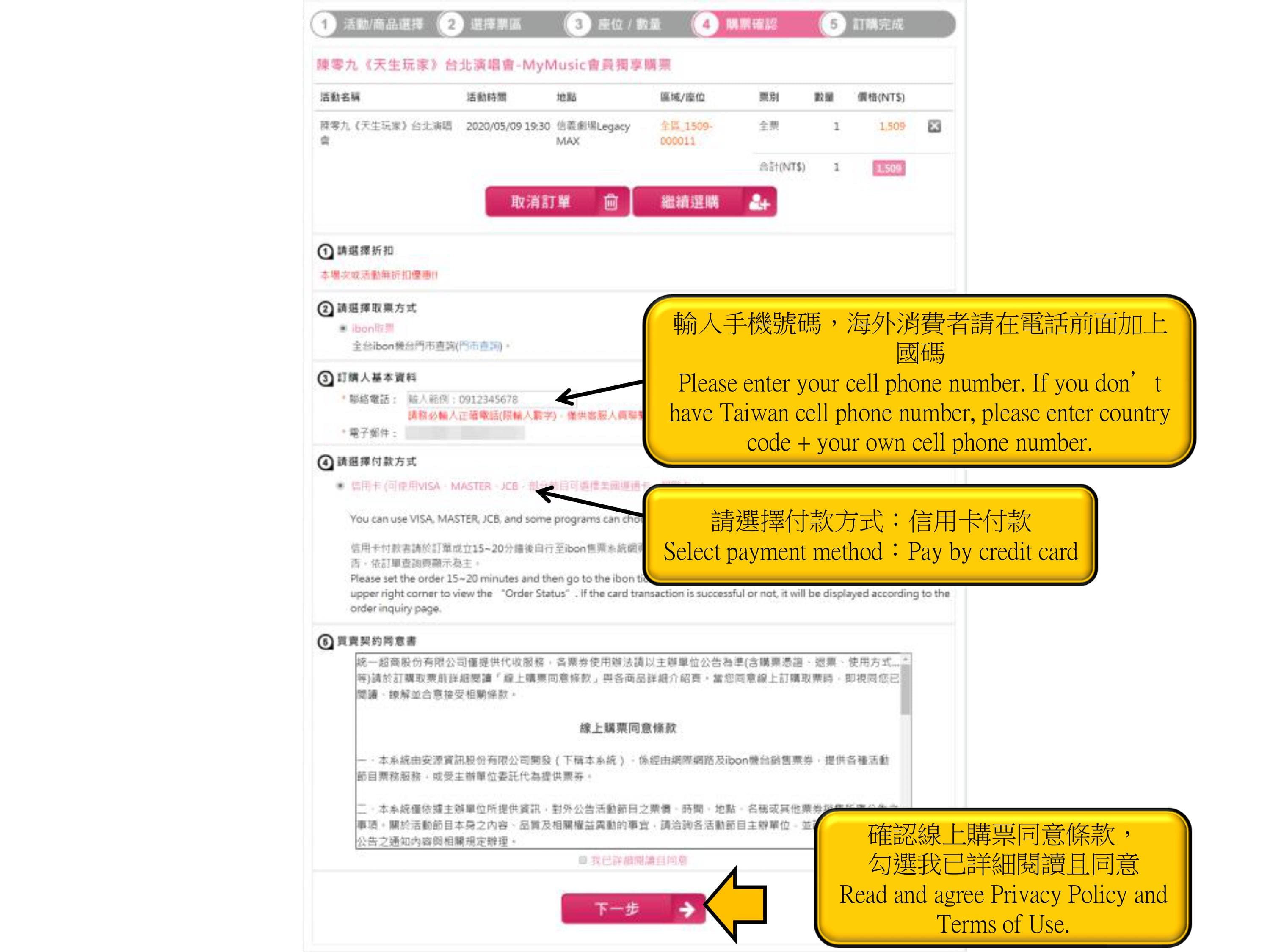 步驟8.確認票種張數、輸入手機、付款方式,點選下一步