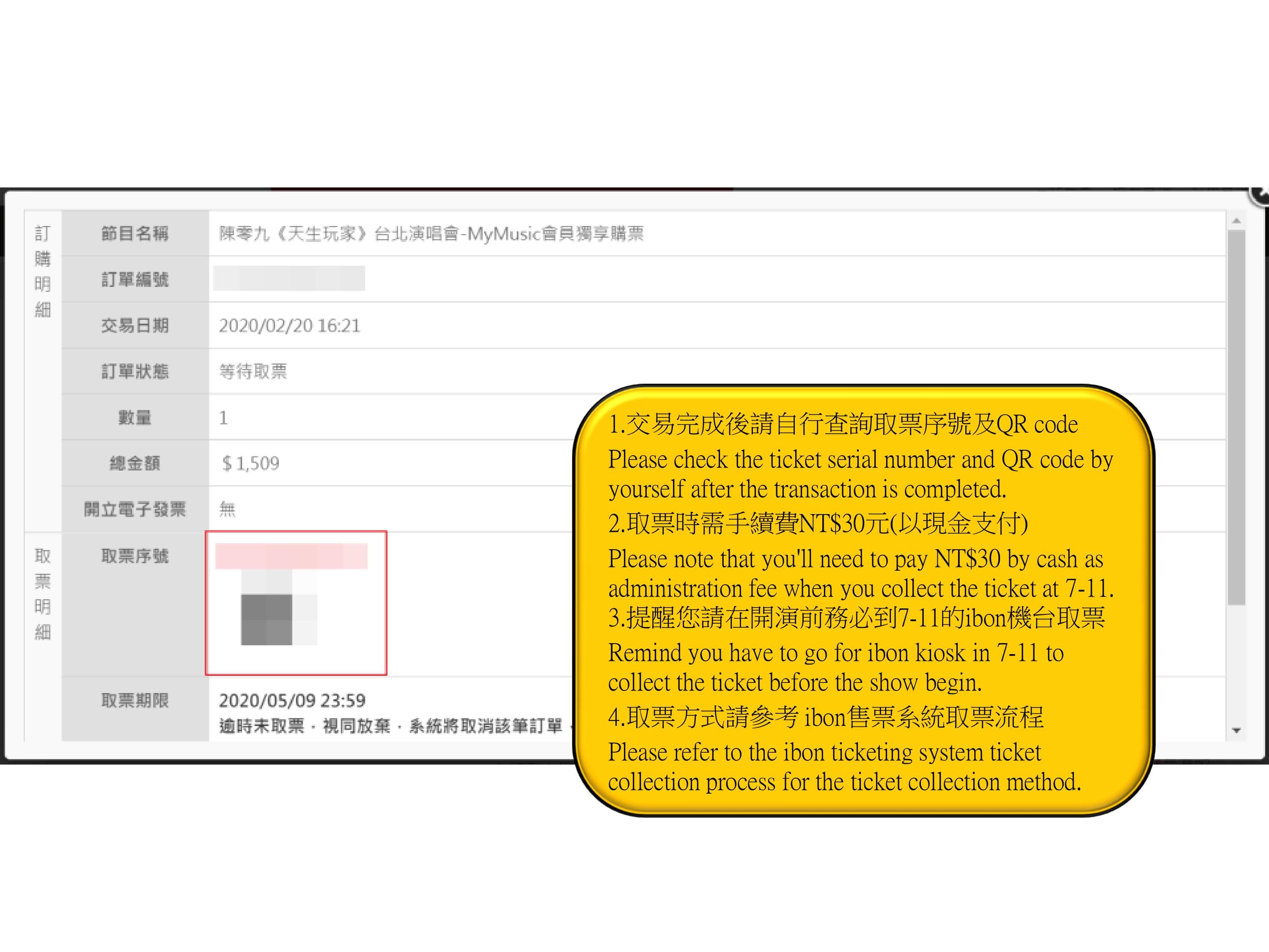 步驟14.取得「取票序號」及「QR code」至ibon機台取票