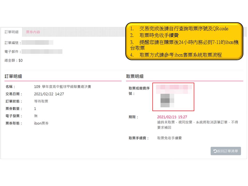 步驟10.取得「取票序號」及「QR code」至ibon機台取票