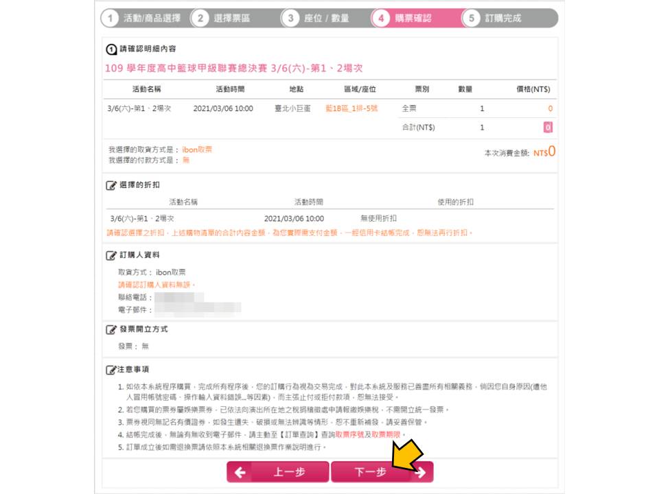 步驟6.確認票種張數、輸入手機、付款方式,點選下一步