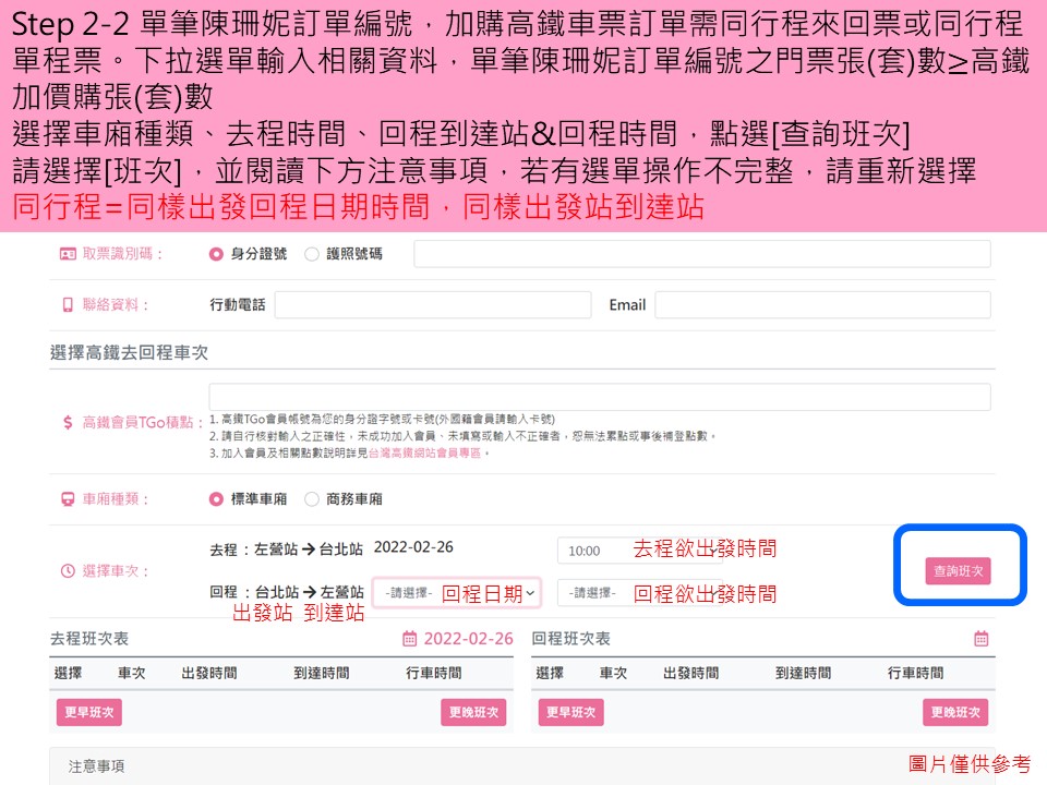 步驟2-1.選取單程或來回票的搭車時間及乘車地點並填寫取票人資料