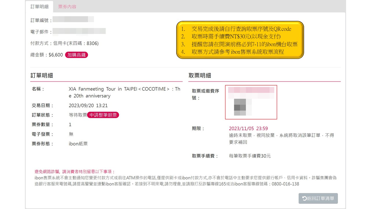步驟12.取得「取票序號」及「QR code」至ibon機台取票