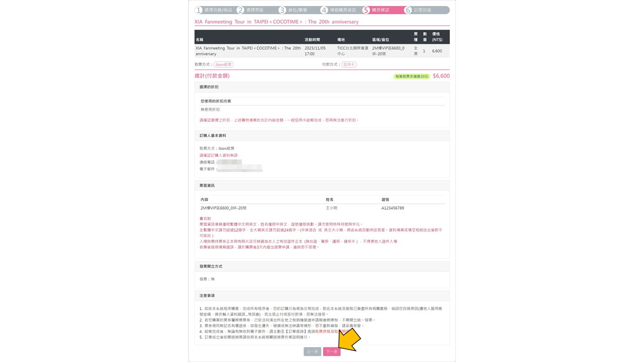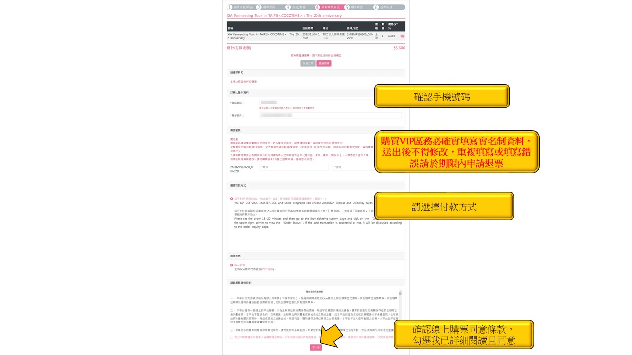 步驟6.確認票種張數、輸入手機、付款方式,點選下一步