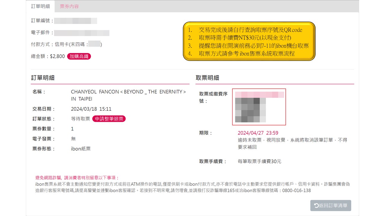 步驟12.取得「取票序號」及「QR code」至ibon機台取票