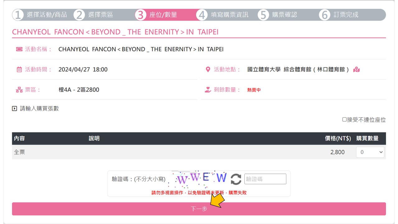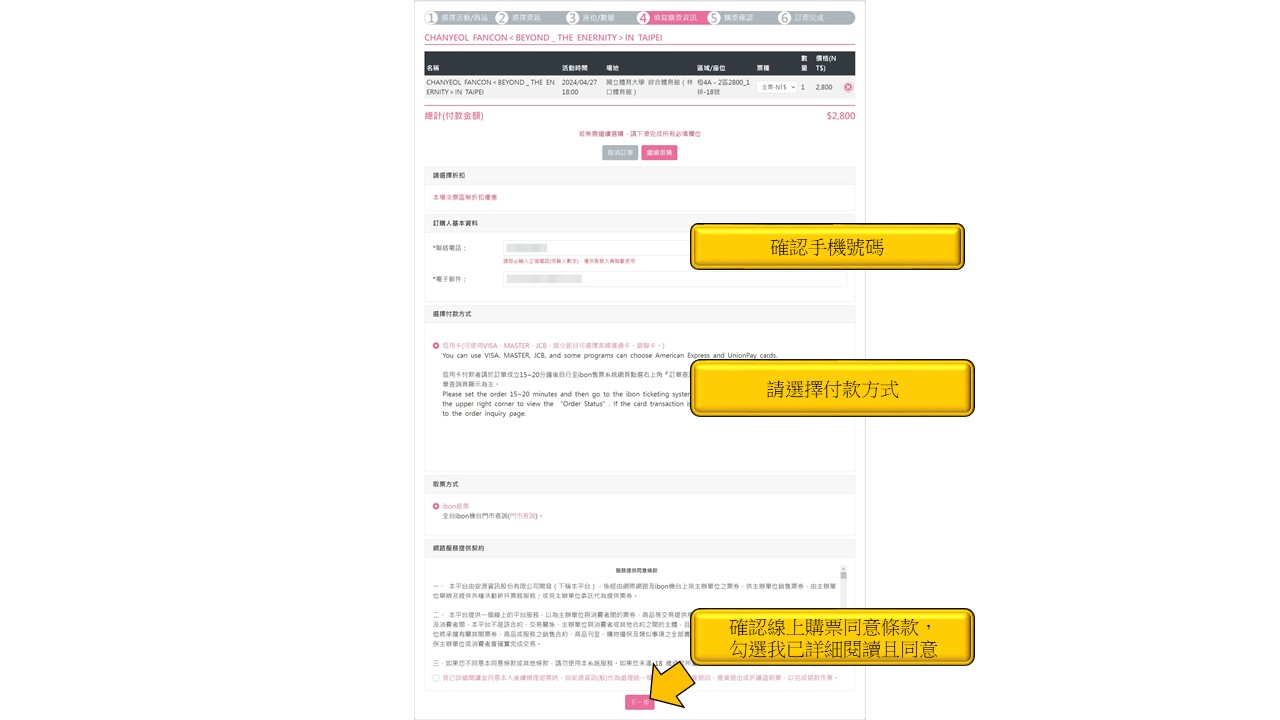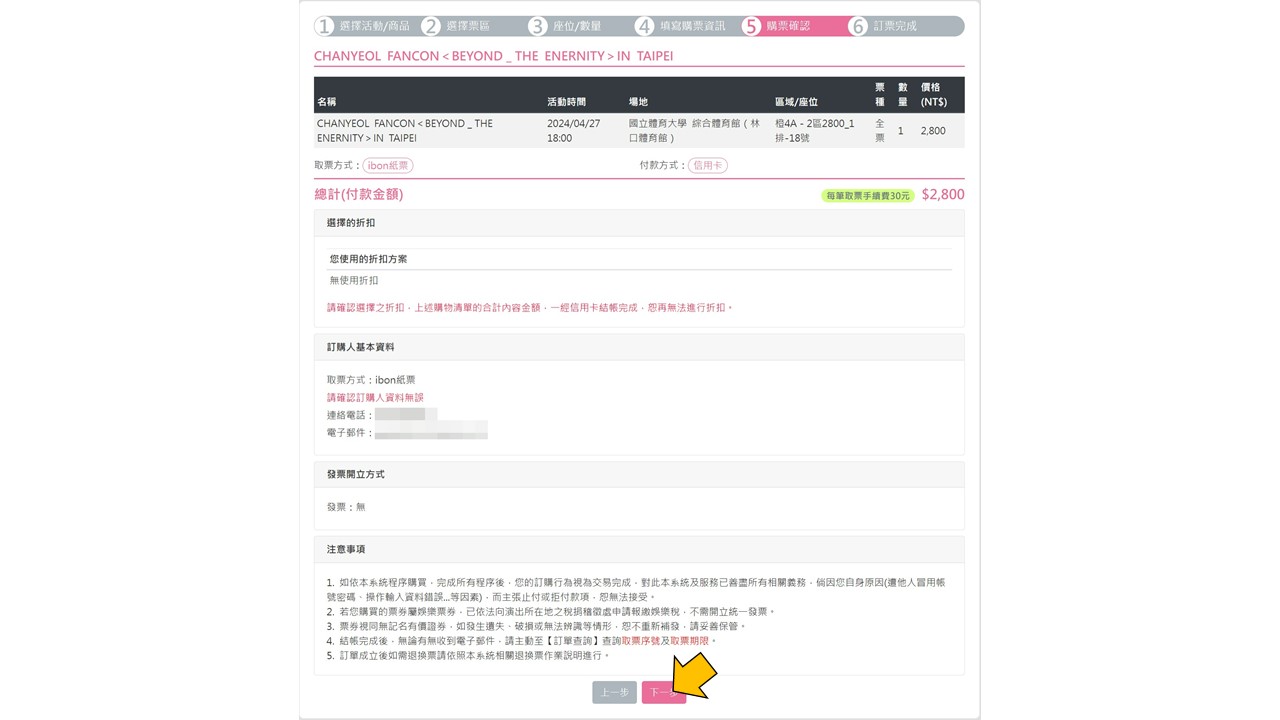 步驟6.確認票種張數、輸入手機、付款方式,點選下一步