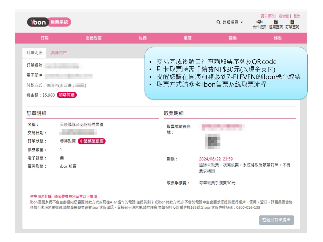 步驟12.取得「取票序號」及「QR code」至ibon機台取票