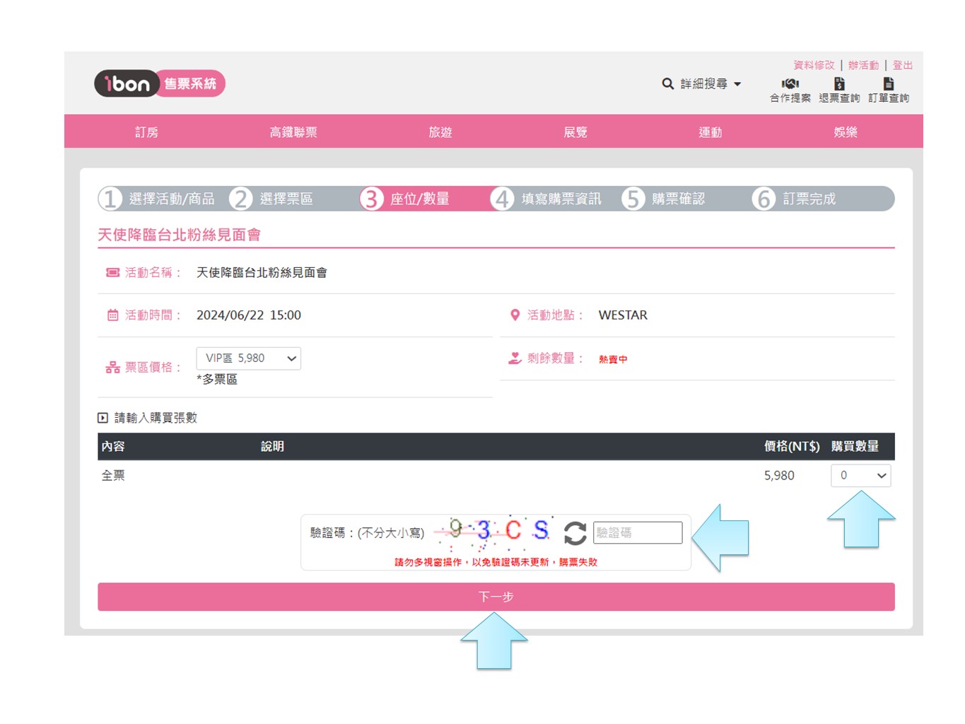 步驟5.選擇張數並輸入驗證碼,點選下一步