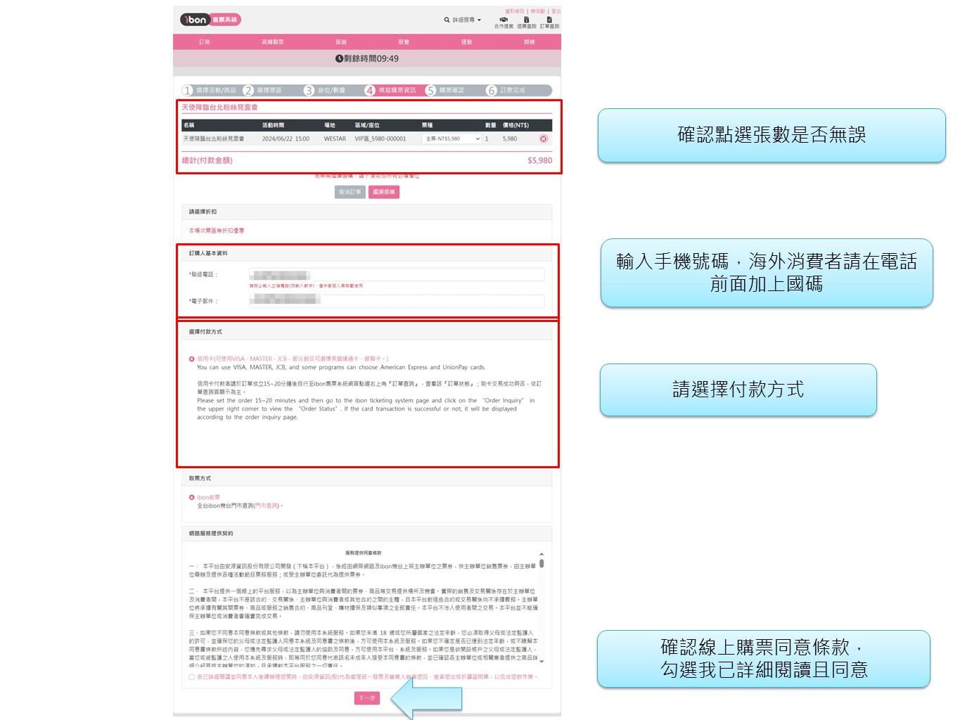 步驟6.確認票種張數、輸入手機、付款方式,點選下一步