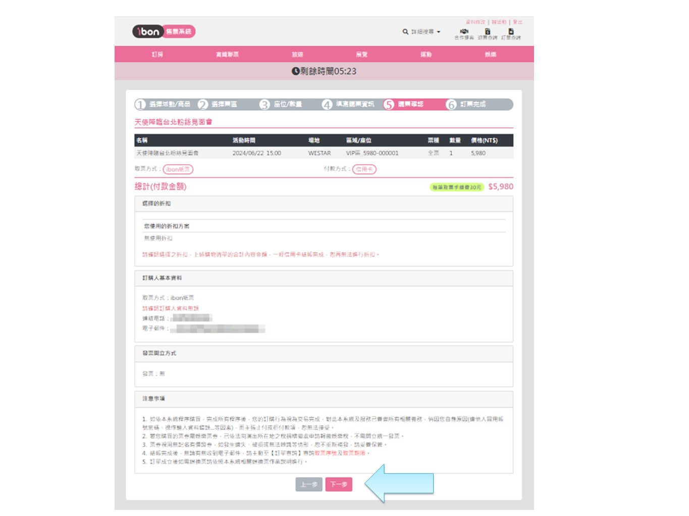 步驟7.再次確認票種張數、付款方式,點選下一步
