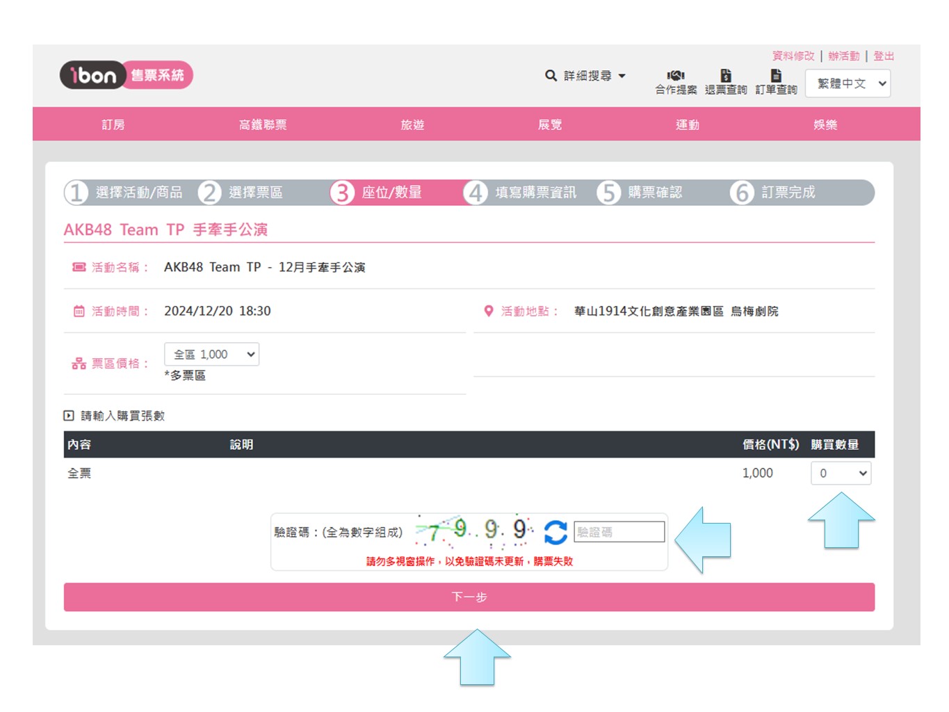 步驟5.選擇張數並輸入驗證碼,點選下一步
