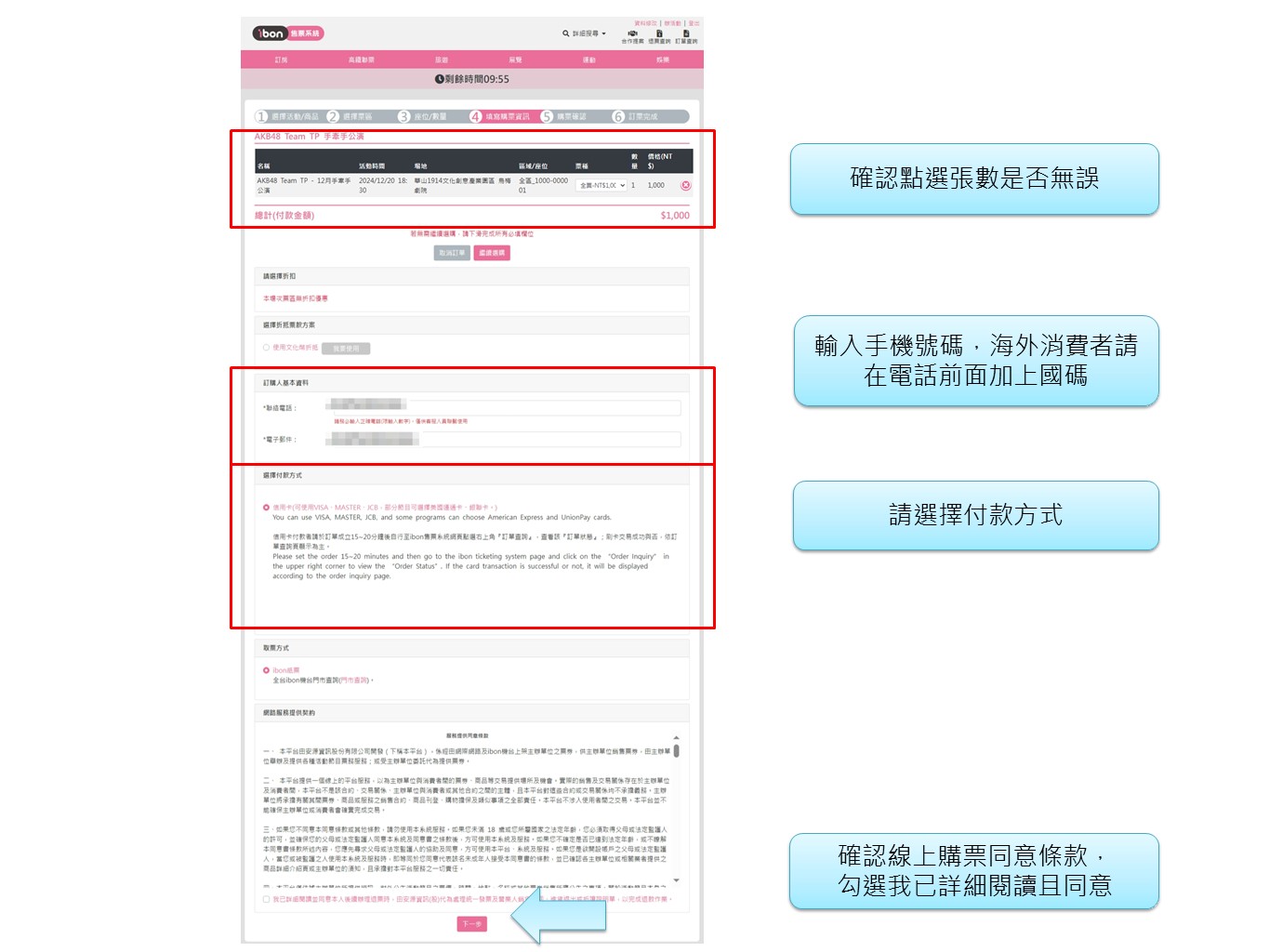 步驟6.確認票種張數、輸入手機、付款方式,點選下一步