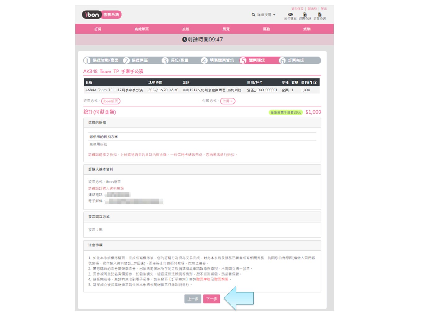 步驟7.再次確認票種張數、付款方式,點選下一步