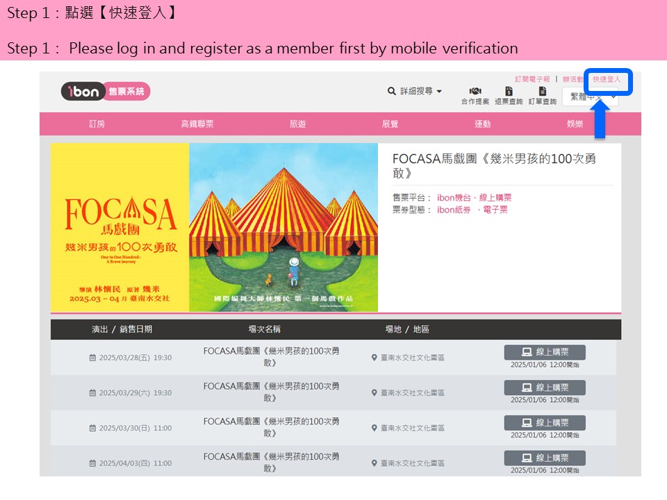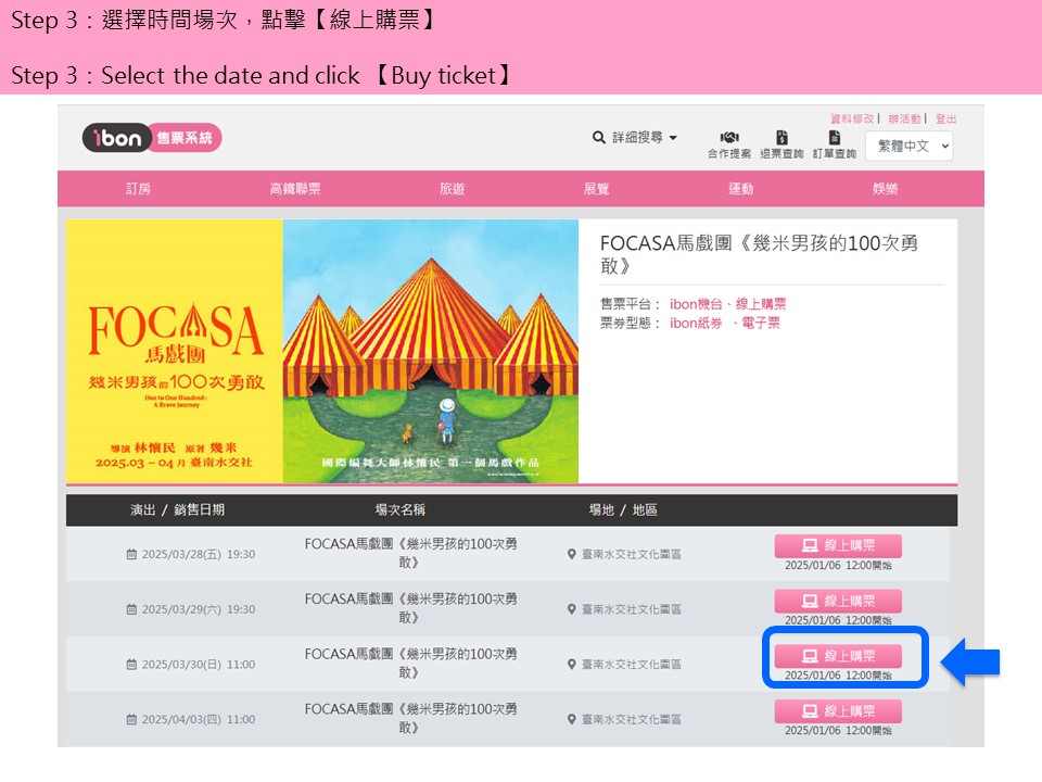 【FOCASA馬戲團《幾米男孩的100次勇敢》】ibon 網站購票流程