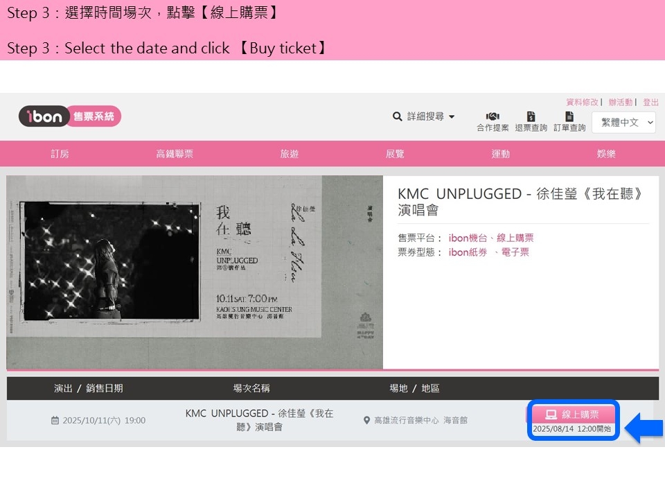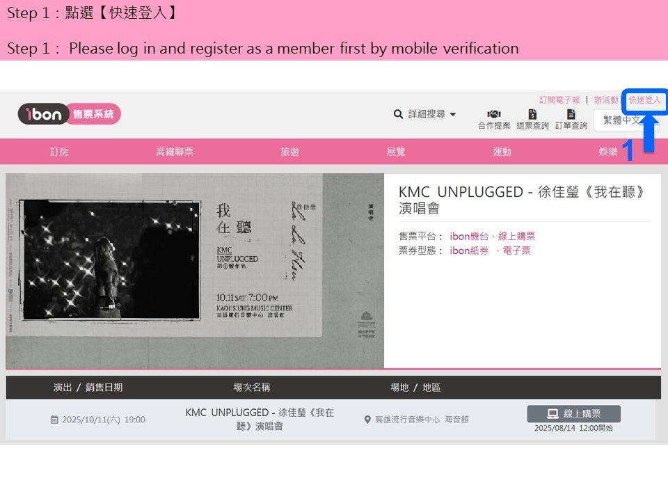 【KMC UNPLUGGED-徐佳瑩《我在聽》演唱會】ibon 網站購票流程