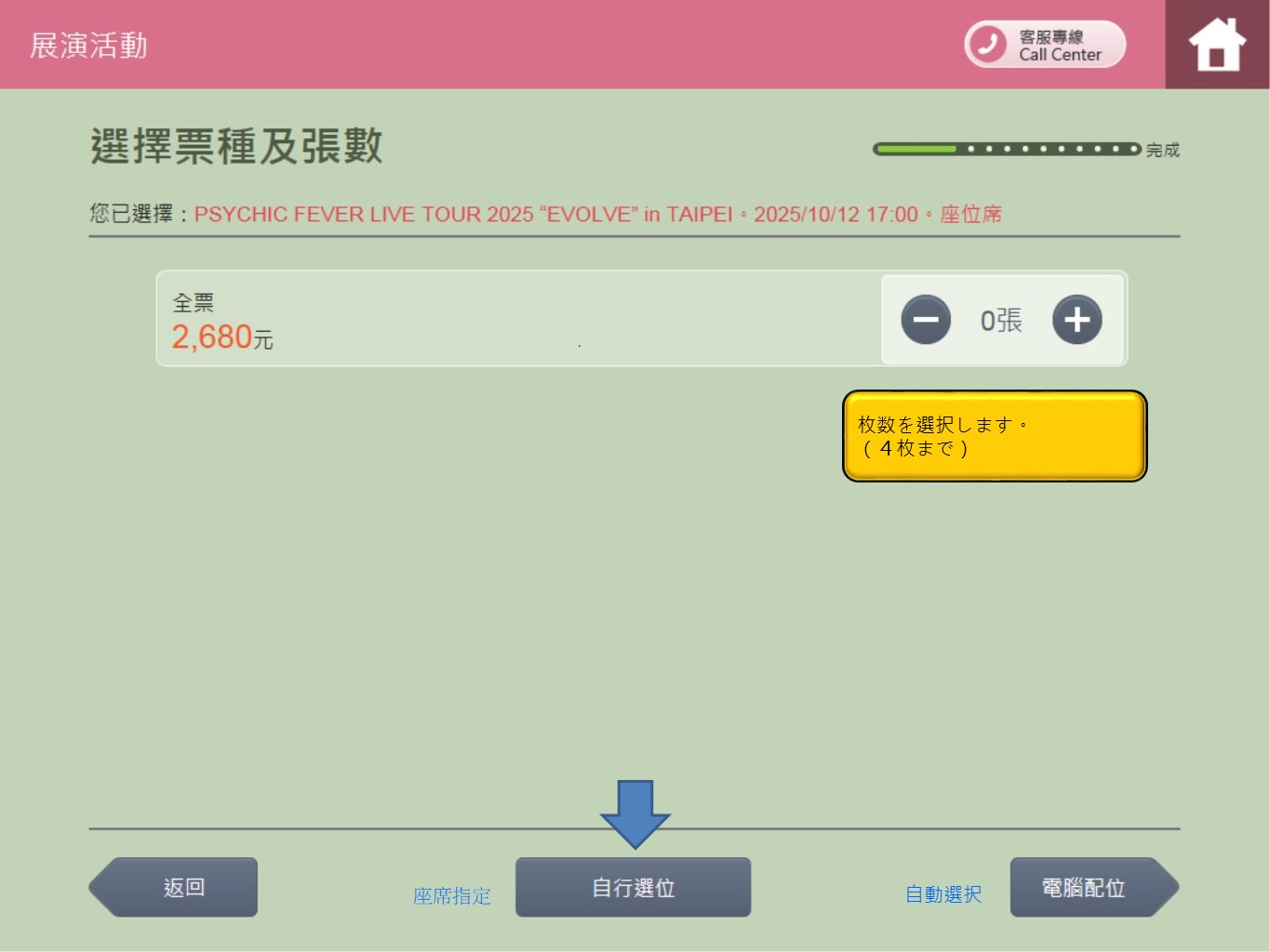 Step 10.枚数を選択し、【電腦配位(自動選択) 】が【自行選位(座席指定)】を選択します